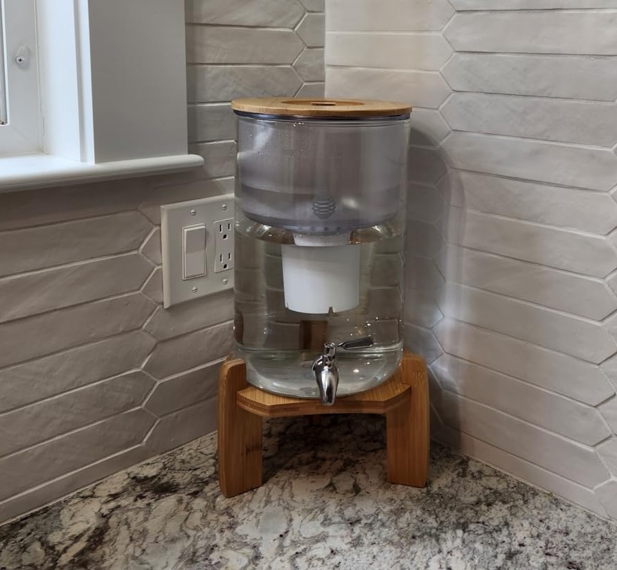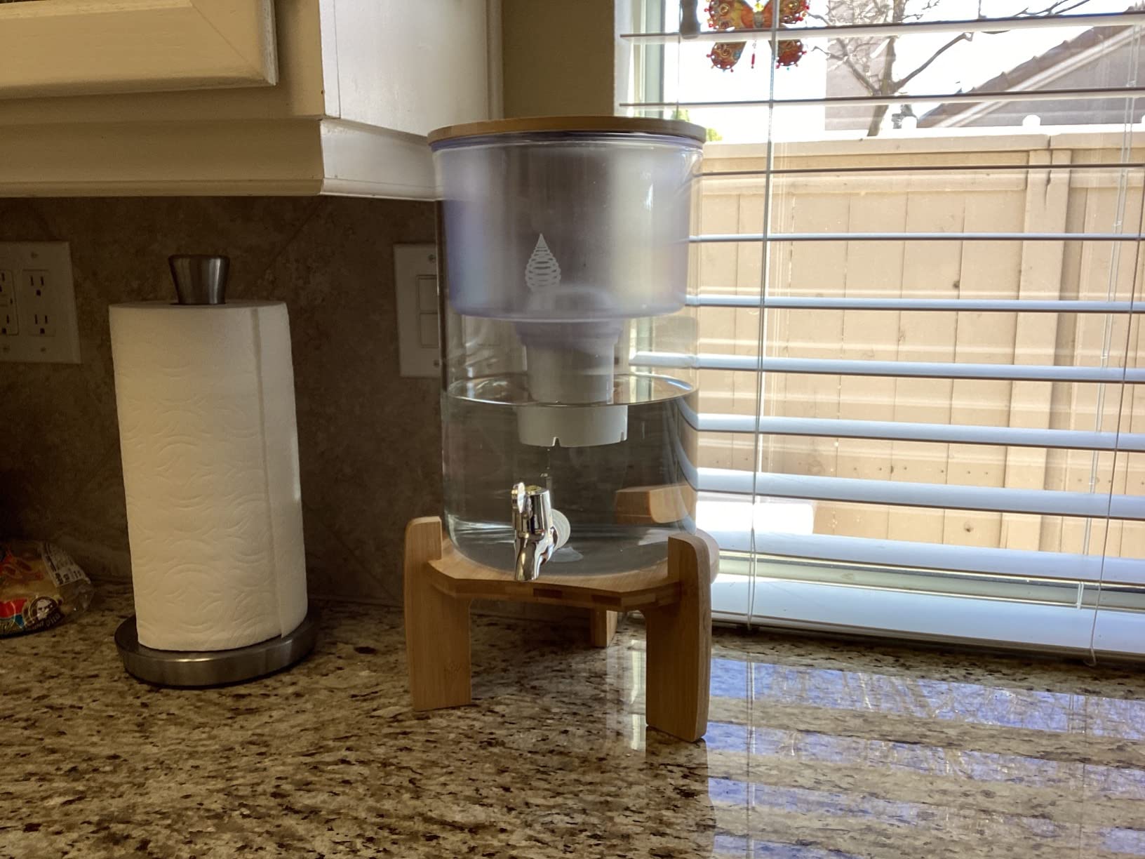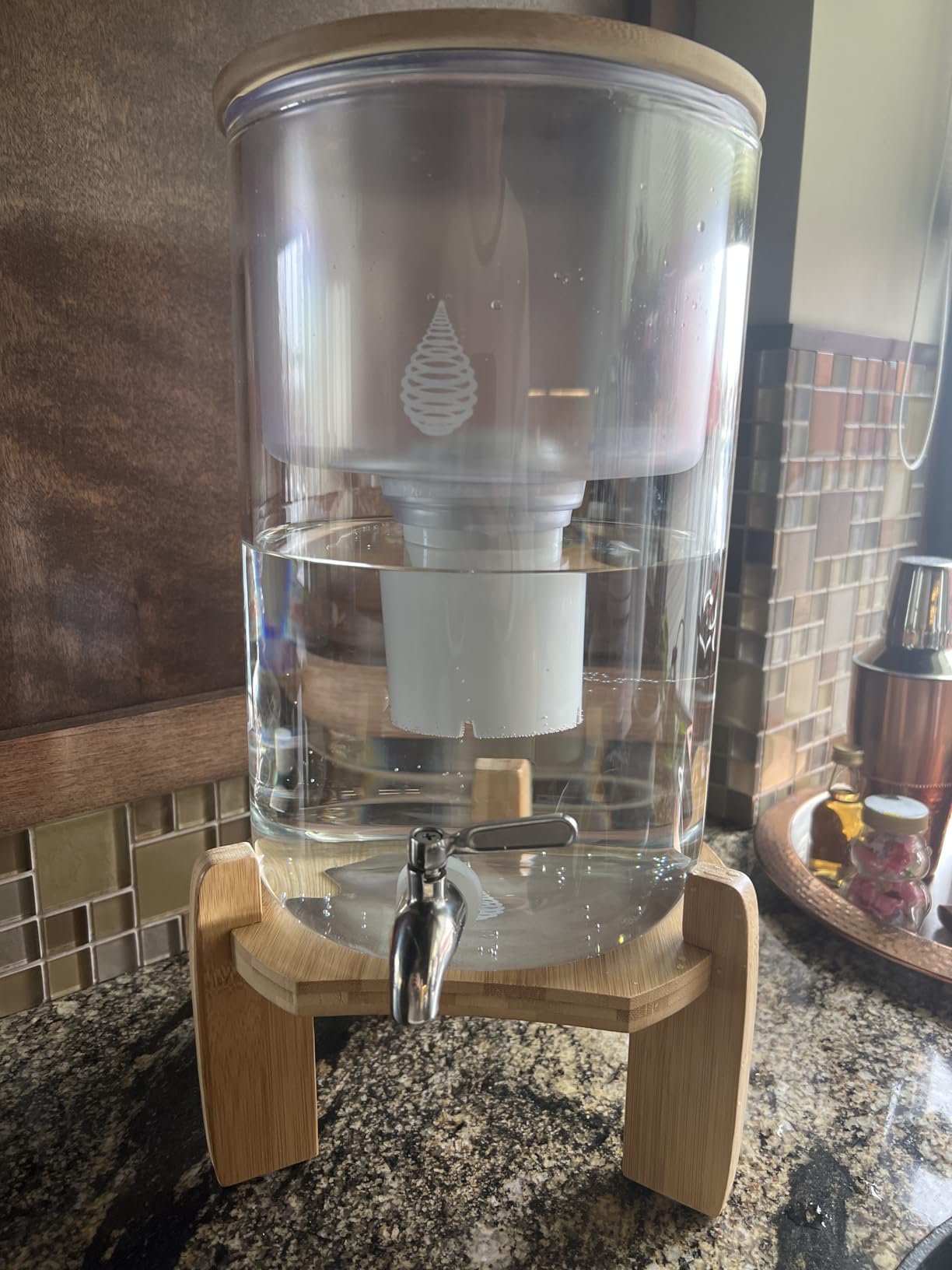 96 gallons per filter | 96 gallons per filter | Increases pH to 9+ | Borosilicate glass, bamboo lid, SAN plastic | 2 gallons / 7.57 liters | WQA Certified to NSF/ANSI standards 42 and 53 | Easy filter replacement, 96 gallon filter life | Borosilicate glass body, Bamboo lid, Food-grade PP plastic | Monthly scrubbing of ceramic filters, rinse filters under cool running water | Estimated 0.5-1 GPM | Height: 17.72 inches, Length: 11 inches, Width: 9.5 inches, Weight: 8.4 lb | No installation required, simply place on countertop | Increases pH to 9+, adds essential minerals | Removes lead, chlorine, heavy metals, microplastics, and chemicals | Borosilicate glass reservoir, bamboo lid, sleek bamboo base |