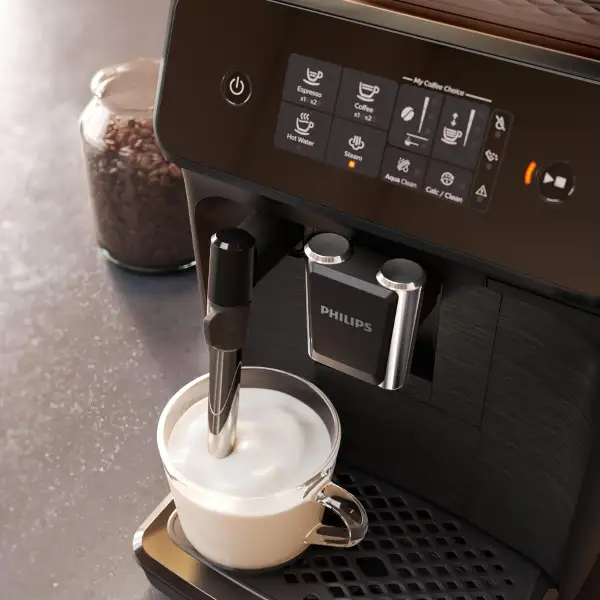 Adjustable grind setting: coarser (clockwise), finer (anti-clockwise) | Light, Medium, Strong | Dispenses steam for silky smooth milk froth, 2-part frother | 1.8 L | 10 ounces / 290 grams | Daily: Empty drip tray. Weekly: Rinse brew group, clean coffee grounds container. Monthly: Use coffee oil remover tablets. Every 500 cups: Lubricate mechanism, replace AquaClean filter. After each use: Clean LatteGo milk system. Regularly: Lubricate brew group. Periodically: Descale machine, clean milk circuit system. Quick Clean function for milk system. Dishwasher-safe milk system parts. | Buttons and labels, deeper menu settings | Espresso, Coffee, Hot water, Cappuccino, Latte, Latte Macchiato | Temperature between 90 and 98°C | Three strength settings: low, medium, high. Adjustable drink volume: 20-70 ml, 40-120 ml. Three temperature settings: warm, medium hot, hot. Classic Milk Frother for steam and milk froth. Intuitive touch display. Aroma Extract system for optimal brewing. Ceramic grinders with 12 grind settings. Automatic descaling notification. Removable and dishwasher-safe parts | Aroma strength: 3 settings (light, medium, strong). Grind adjustment: 12 levels. Coffee temperature: Adjustable. Milk temperature: Adjustable. Milk foam temperature: Adjustable. Drink quantity: 3 settings (low, medium, high). Coffee volume: Adjustable. Pre-infusion: Yes. 2-cup function: Yes (non-milk drinks) | Glossy Black and Matte Black, chrome highlights, ceramic grinders | 1500 W power consumption | Height: 14.6 inches, Width: 9.6 inches, Depth: 17 inches | 2-year warranty, support by Philips or authorized dealer |