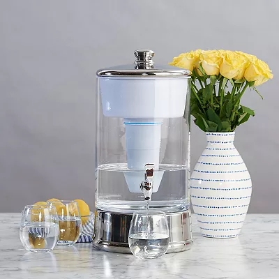 5-stage ion exchange technology | 40 Cups / 320 oz / 9.5L | Ready-Pour technology, one-hand push and pour spout | Change in taste or smell, TDS reading of 006 or higher | 0.03 gallons per minute, 15 minutes per half gallon | Glass, metal, BPA-free, chrome spigot | Glass material, silver color, 19.75'' x 9.75'' x 11'' dimensions | Easy installation, twist-and-seal filter, rinse and dry maintenance | 19.75'' x 9.75'' x 11'' / 12.5 lbs | BPA-free housing | Filter lasts 5 months, 40-50 gallons, or TDS > 006 | - Lead: 99.7% reduction - Chromium: 99.7% reduction - PFOA/PFOS: 99.7% reduction - Mercury: 99% reduction - TDS: 99.6% reduction - Chlorine: Removed - Chloramine: Reduced - Arsenic: 99% reduction - Fluoride: 99% reduction | Compatible with ZeroWater 5-stage filters only | Fill reservoir, allow water to pass through filter, refill as needed | Warranty and customer support: 1-year warranty, dedicated customer service |