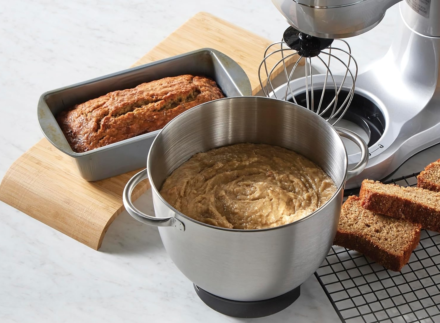 The 4-quart stainless steel bowl provides ample capacity for most family-sized recipes, easily handling up to 6 dozen cookies or 2 loaves of bread in a single batch.